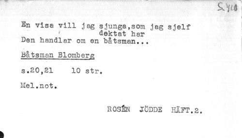 //// En visa vill jag sjunga,som jag sjelf //// dektat har //// Den handlar om en båtsman... //// Båtsman Blomberg //// s.20,21 10 str. //// Mel.not. //// ROSÉN JC-DDE HAFT. 2. ////