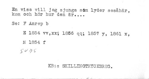 //// En visa vill jag sjunga s6m lyder sesåhär, //// kom och hör hur den är.... //// Se: F Anrep b //// E 1854 vv,xx; 1856 qq; 1857 y, 1861 x, //// N 1854 f //// 3 ^ / ^ //// KB:s SKILLINGTRYCKSREG. ////