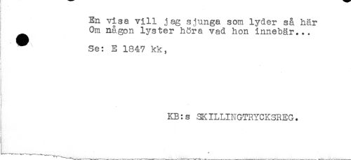 //// En visa vill jag sjunga som lyder så här //// Om någon lyster höra vad hon innebär... //// Se: E 1847 kk, //// : //// < //// s //// KB:s SKILLINGTRYCKSREG. //// < ////