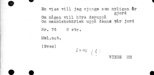 //// En visa vill jag sjunga som nyligen år //// gjord //// Om någon vill höra deruppå //// Om menniskokärlek uppå denna Var jord //// Nr. 76 8 str. //// Mel.not. //// (Svas) //// f ^ ^ ) //// WIEDE MS ////