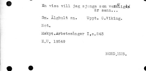 //// * En visa vill jag sjunga san ve:RÉ.igå% //// är sann... //// Sm. Älghult sn. Uppt. C.Viking. //// Not. //// Mskpt.Arbetssånger I,s.243 //// E.U. 19549 //// E //// NORD.HUS. ////