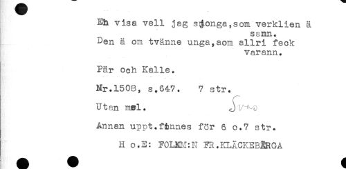 //// Eh visa vell jag s$onga,som verklien ä //// sann. //// Den ä om tvänne unga,aom allri feck //// varann. //// Pär och Kalle. //// ** - *** -^ //// Mr.1508, s.647. 7 str. //// Uten mel. //// Annan uppt.finnes f8r 6 o.7 str. //// H o.E: F0Lm,l:N FR.KLACKEBERGA ////