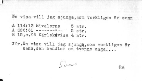 //// ! //// ! //// En visa vill jag sjunga,som verkligen är sann //// A 114:13 Rivalerna 5 str. //// A 326i61---- 5 str. //// B 15,s.96 Kärlekåvisa 4 str. //// *** * .. //// Jfr.En vi:sa vill jag sjunga,som verkligen är //// sann,den handlar om tvenne unga.... //// ^ - ' RA ////
