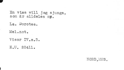 //// En visa vill jag sjunga, //// som är alldeles ny. //// La. Dorotea. //// Mel.not. //// Visor IV.s.3. //// E.U. 20411. ////