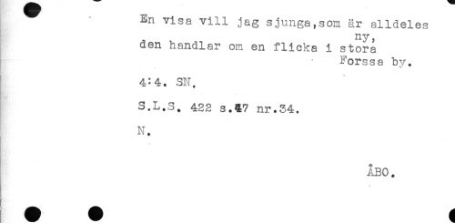 //// En visa vill jag sjunga,som är alldeles //// ny, //// den handlar om en flicka i stora //// Forssa bv. //// 4:4. SN. //// S.L.S. 423 s.37 nr.34. //// N. //// ÅBO. ////
