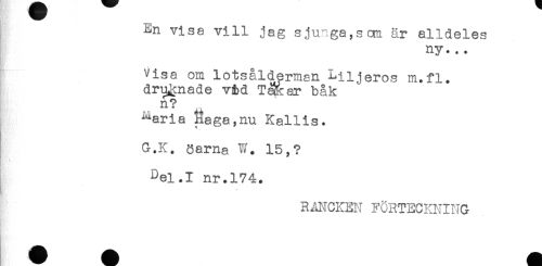 //// En visa vill jag sju-ga,scm är alldeles //// ny... //// Visa om lotsålderman Liljeros m.fl. //// dru^nade v&d Ta&rar båk //// n? //// Maria Raga,nu Kallis. //// G.K. earna W. 15,? //// Del.I nr.174. //// B* //// RåNCKEN FÖRTECKNING ////