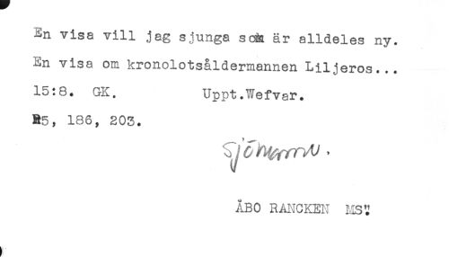 //// ^n vise vill jag sjunga soia är alldeles ny. //// En visa om kronolotsåldermannen Liljeros... //// 15:8. GK. Uppt.Wefvar. //// R5, 186, 203. //// ÅBO RAI-ICKEN MS'J ////