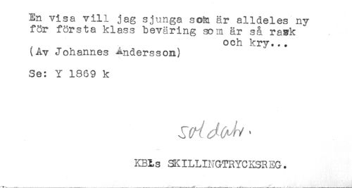 //// En visa vill jag sjunga soM är alldeles ny //// för första klass beväring som är så rask //// och kry... //// (Av Johannes Andersson) //// Se: Y 1869 k //// KKE,s SKILLINGTRYCKSREG. ////