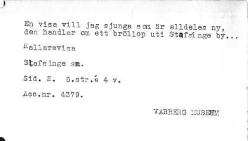 //// f //// En visa vill jag sjunga som är alldeles nv, //// den handlar om ett bröllop uti Stafsinge by... //// Rallarevisa //// t //// Stafsinge sm. //// . * c //// Sid. 2. 6.str.a 4 v. //// ! j //// a //// Acc.nr. 4379. //// VARBERG MUSEHM ////