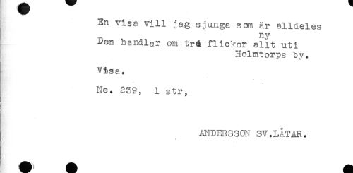 //// En visa vill jag sjunga san är alldeles //// ny //// ^en handlar om trä flickor allt uti //// Holmtorps by. //// V&sa. //// * //// Ne. 339, 1 str, //// ANDERSSON SV.LÅTAR. //// * * ////