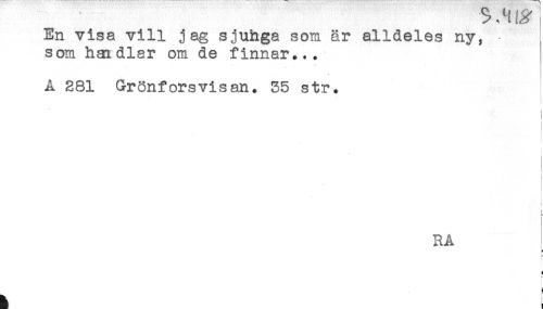 //// ,7 i //// En visa vill jag sjuhga som är alldeles ny, - //// som haidlar om de finnar... //// A 281 Grönforsvisan. 35 str. //// < //// i //// < //// i //// ! //// ! //// ! //// t //// < //// RA //// * //// = //// } //// H //// i //// f ////