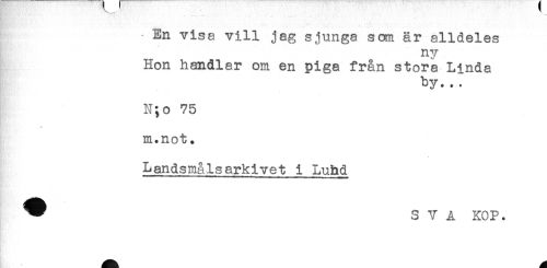 //// En visa vill jag sjunga som är alldeles //// ny //// Hon handlar om en piga från stora Linda //// by. .. //// * //// N;o 75 //// m.not. //// Landsmålsarkivet i Luhd //// ^ SVA KOP. ////
