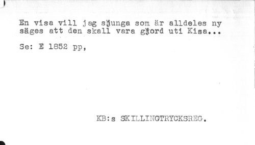 //// En visa vill jag sjunga som är alldeles ny //// säges att den skall vara g^ord uti Kisa..'* //// * //// * * * . * f //// i //// Se: E 1852 pp, //// f //// ) //// i //// ! //// - //// ! //// KB:s SKILLINGTRYCKSREG. ////