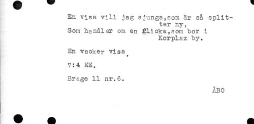 //// En visa vill jag sjunga,som är så split- //// ter ny. //// Som handlar om en gli eka, som bor i //// Korplax by. //// En vacker visa //// * //// 7:4 EE. //// Brage 11 nr.6. //// ÅBO ////