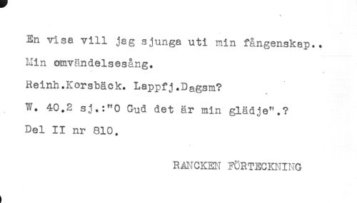 //// En visa vill jag sjunga uti min fångenskap.. //// Min omvändelsesång. //// Reinh.Korsbäck. Lappfj.Dagsm? //// W. 40.3 sj.:"0 Gud det är min glädje".? //// Del II nr 810. //// RANCKEN FORTECKNING ////