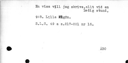 //// En visa v$ll jag skri va, allt vid en //// ledig stund, //// * t* //// 9:8. Lilla Hågön. //// S.L.S. 49 a s.217-221 nr 16. ////