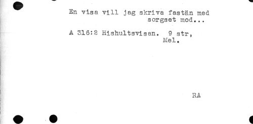 //// En visa vill jag skriva fastän med //// sorgset mod... //// Å 316:2 Hishultsvisan. 9 str, //// Mel. //// RA ////