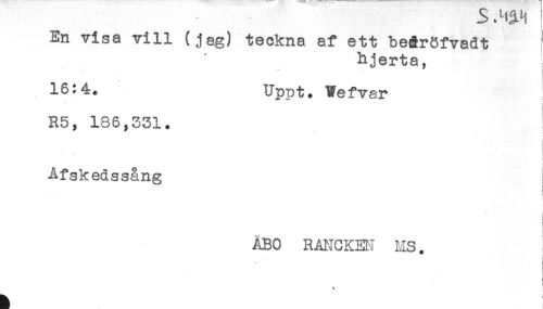 //// En visa vill (jag) teckna af ett be&röfvadt //// hjerta, //// 16:4. Uppt. Wefvar //// R5, 186,331. //// Afskedssång ! //// t //// ABO RANCKEN MS. ////