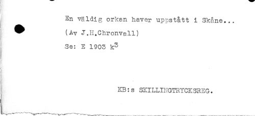 //// } //// En väldig orken haver uppstått i Skåne... //// ^ (Av J.H.Chronvall) //// Se: E 1903 k^ //// T //// ^^^^^^ ^ **** //// I KB:s SKILLINGTRYCKSREG. ////