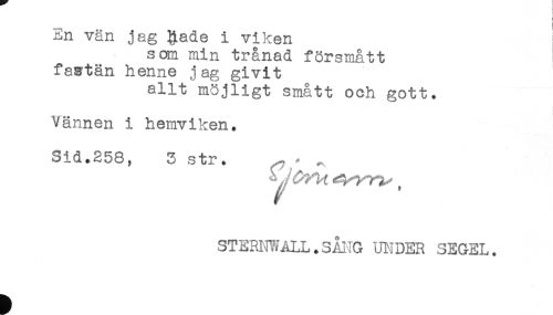 //// ) //// i //// En vän jag Rade i viken //// som min trånad försmått //// fastän henne jag givit //// allt möjligt smått och gott. //// Vännen i hemviken. //// Sid.258, 3 str. ^ . „ //// STERNY/ALL.SÅNG UNDER SEGEL. ////
