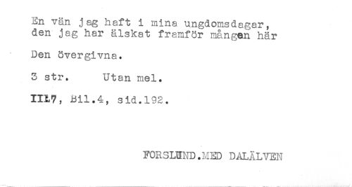 //// ^n vän jag haft i mina ungdomsdagar, //// den jag har älskat framför mången här //// Den övergivna. //// 5 str. Utan mel. //// IIL7, Bil.4, sid.192. //// FORSLUND.MED DALÄLVEN ////