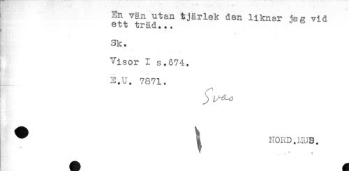 //// En vän utan tjärlek den liknar lag vid //// ett träd... ^ ^ //// Sk. //// Visor I s.674. //// E.U. 7871. //// ^ ^ NORD. MUS. //// A ^ ////