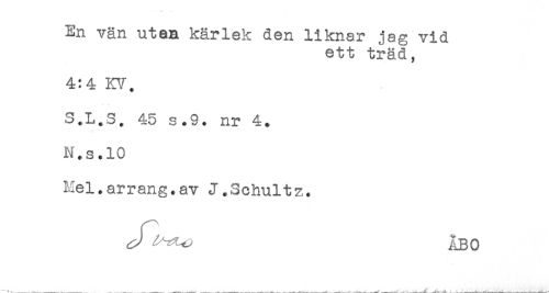 //// En vän utan kärlek den liknar jag vid //// ett träd, //// 4:4 KV. //// S.L.S. 45 s.9. nr 4. //// N.s.10 //// Mel.arrang.av J.Schultz. //// ".....<- ÅBO ////