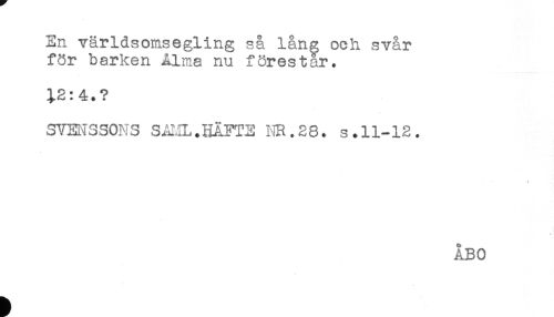 //// En världsomsegling så lång och svår //// för barken Alma nu förestår. //// 12:4.? //// SVENSSONS SAML. HÄFTE NR.28. s.11-12. //// * ////