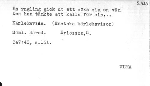 //// En yngling gick ut att söka sig en vän //// Den han tänkte att kalla för sin... //// Karleksviåa. (Enstaka kärleksvisor) //// Sdml. Härad. Ericsson,G. //// 347:48, s.151. //// i //// t //// ! //// i //// t //// r //// } //// - ! //// t //// I //// ULIIA //// < ////