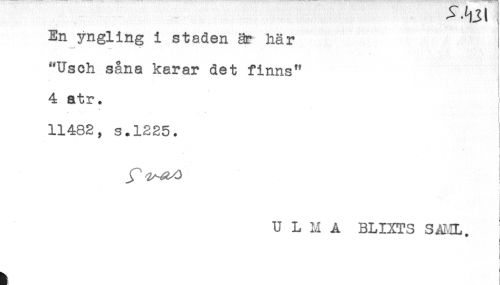 //// En yngling i staden är här //// "Usch såna karar det finns" //// ^ ' //// 4 atr. //// * ' . ' * //// 11482, s.1225. //// - //// t //// < t //// U L M A BLIXTS SAf.IL. ' //// i ////