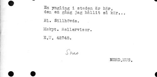 //// En yngling i staden är här, //// den en gång jag hållit så kär... //// Bl. Sillhövda. //// Mskpt. Rallarvisor. //// ? //// E.U. 42748. //// NORD.HUS. ////