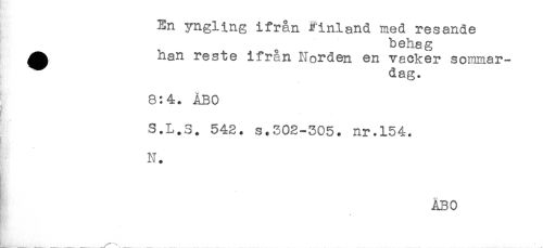 //// En yngling ifrån Finland med resande //// behag //// ^ han reste ifrån Norden en vacker sommar- //// dag. //// 8:4. ÅBO //// S.L.S. 542. s.302-305. nr.154. //// N. //// ÅBO //// L_____ ////
