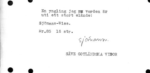 //// En yngling jag ng vorden är //// uti ett stort elände: //// Sjömans-Wisa. //// Nr.85 16 str. //// . ' //// SÄVE GOTLÄNDSKA VISOR ////