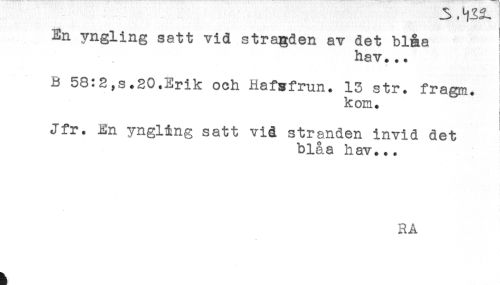 //// En yngling satt vid stragden av det blåa //// < //// hav... //// B 58:2,s.SO.Erik och Hafgfrun. 13 str. fragm. //// kom. //// i //// Jfr. En yngling satt vid stranden invid det //// blåa hav... //// RA ////