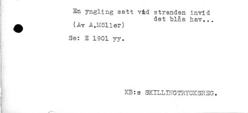 //// En yngling satt v&d stranden invid //// det blåa hav... //// ^ (Av A.Möller) //// Se: E 1901 yy. //// KB:s SKILLDIGTRYCKSREG. //// - //// t. _____^ ////