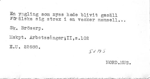 //// j //// En yngling som nyss hade blivit gesäll //// Förälska sig strax i en vacker mamsell... //// Sk. Brösarp. //// Hskpt. Arbetssånger;II,s.l02 //// E.U. 22688. //// ^ / ? - //// NORD.MUS. ////