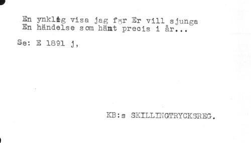 //// En ynklig visa jag f^r Er vill sjunga //// En händelse som hämt precis i år../' //// Se: E 1891 j, //// KB:s SKILLINGTRYCK3REG. //// t ////