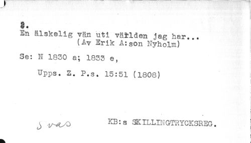 //// g. //// En älskelig vän uti väUden jag har... //// (Av Erik A:son Nyholm) //// Se: N 1830 a; 1833 e, //// Upps. 2. P.s. 15:51 (1808) //// : //// L //// i //// r //// ! //// j KB:s SK ILLIHGTRYCK3REG. //// } ////