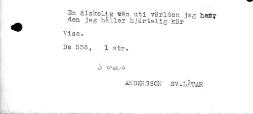 //// En älskelig vän uti världen jag hatr //// den jag haller hjärtelig kär ' //// Visa. //// Da 536, 1 str. //// B* //// ^IVDERSSON SV. LÅT^R ////