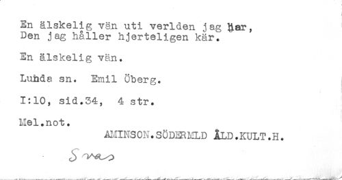 //// En älskelig vän uti verlden jag Rar, //// Den jag håller hjerteligen kär. //// En älskelig vän. //// Lunda sn. Emil Oberg. //// 1:10, sid.34, 4 str. //// Mel.not. //// AMINSON.SÖDERMLD ALD.KULT.H. ////