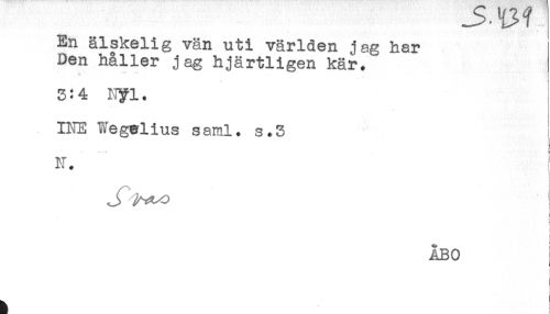 //// En älskelig vän uti världen jag har //// Den håller jag hjärtligen kär. //// 3:4 Nyi. //// INE Wegelius saml. s.3 //// i //// N. //// i //// ÅBO ////