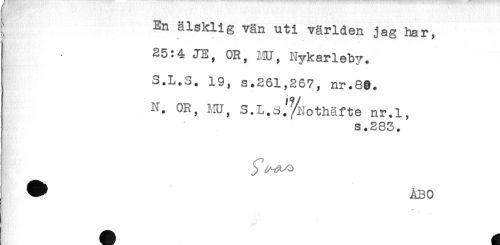//// ^ En älsklig vän uti världen jag har, //// L ; ; , ' - * ' //// 25:4 JE, OR, liU, Nykarlebv. //// S.L.S. 19, s.261,267, nr.8g. //// N. OR, rn, S.L.dJ^othäfte nr.l, //// s.283. //// ^ ÅBO ////