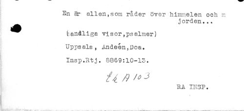 //// En är allén,som råder över himmelen och m //// jorden... //// Oandliga visor,psalmer) //// Uppsala, Andeen.Doa. //// i //// s //// i //// ! Insp.Rtj. 8869:10-13. //// ! //// ! //// RA INSP. //// * ////