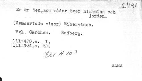//// En ar den,som råder över himmelen och //// jorden. //// (Ramsartade visor) Bibelvisan. //// Ygl. Gärdhem. Hudberg. //// 111:478,s. 1, //// 111:504,s. 23. //// ULMA ////