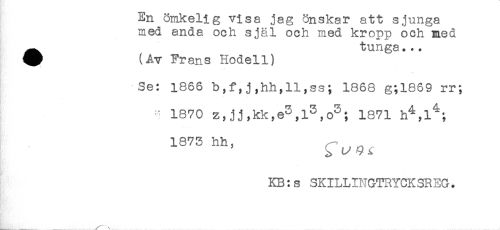 //// Ln ömkelig visa jag önskar att sjunga //// med anda och själ och med kropp och med //// ^ tunga.* * //// ^ (Av Frans Hodell) //// t ^ //// Se: 1866 b,f,j,hh,ll,ss; 1868 g;1869 rr; //// ' 1870 z,jj,kk,e3,l3,o3; 1871 //// 1873 hh, ^ //// . //// KB:s SKILLINGTRYCKSREG. //// ___ . ^......, ////