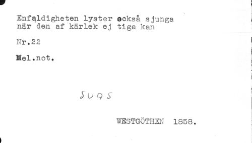 //// Enfqldigheten lyster också sjunga //// när den af kärlek ej tiga kan //// Nr.22 //// Mel.not. //// } //// t //// u Q ^ //// WESTGöTHEN 1858. //// i //// ^ ' ' . ! ////