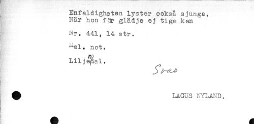 //// Enfaldigheten lyster också sjunga, //// } Når hon far glädje ej tiga kan //// Rr. 441, 14 str. //// ^el. not. //// Liljeval. //// < //// i //// ^ LAGUS IJYLÅND. //// < ////