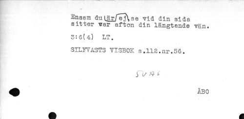 //// Ensam du(är/el\se vid din sida //// sitter var afton din längtande vän. //// 5:6(4) LT. //// * ^ //// SILFV^TS VISBOK s. 112.nr.56. //// j v ////