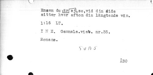//// ___ //// Ensam du tär[ej].se,vid din åida //// sitter hver afton din längtande vän. //// 1:16 LT. //// . I N E. Gammals.visb. nr.35. //// Romans. //// ÅBO ////