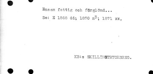 //// Ensam fattig och f&rglömd... //// Se: E 1868 dd; 1870 n^; 1871 xx, //// * //// f //// - //// KB:s SKILLBim^RYCKSREG. ////